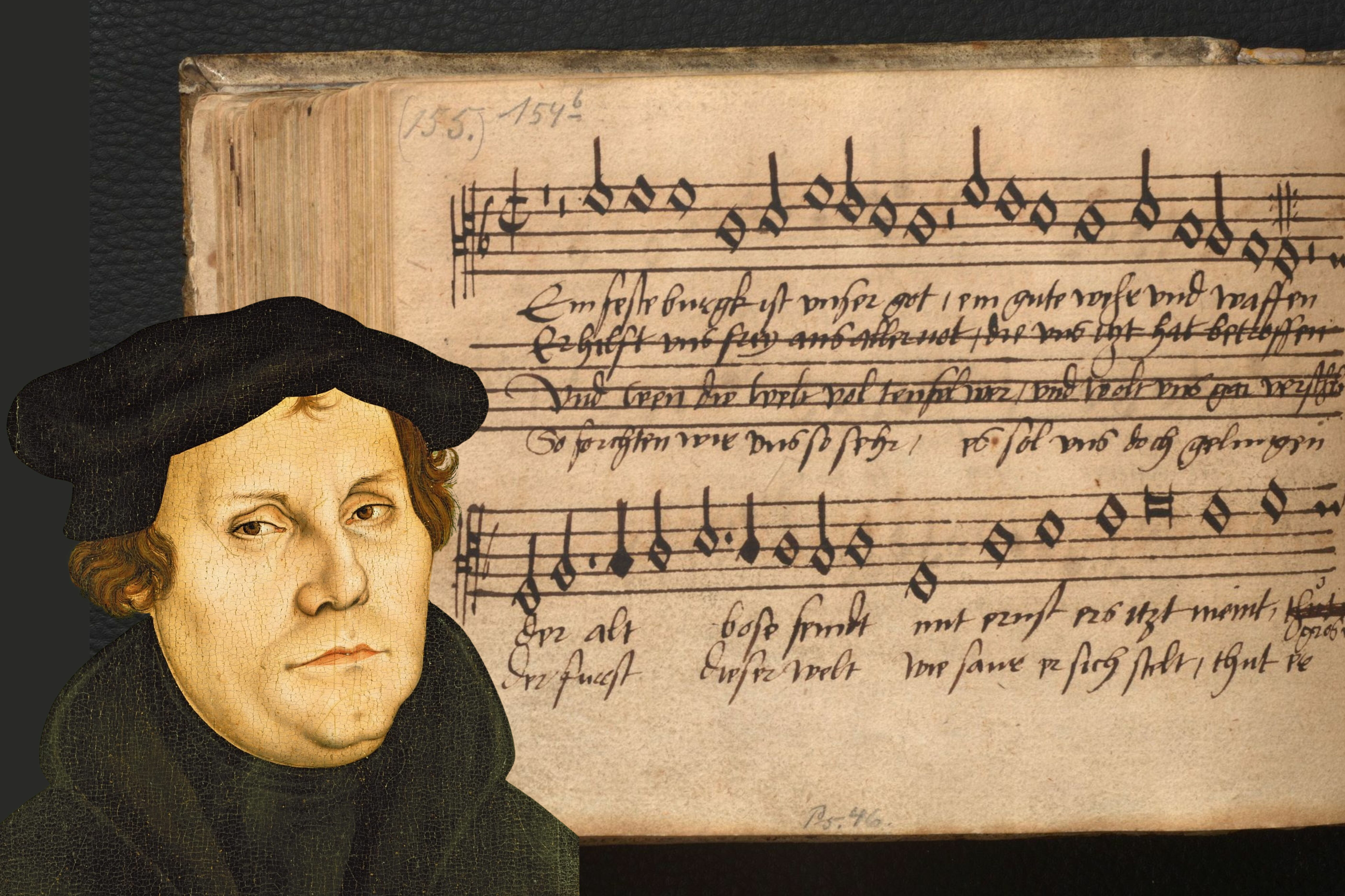 Image: Porträt des Martin Luther, Workshop of Lucas Cranach the Elder, PD, Wikimedia Commons. + A Mighty Fortress is Our God manuscript, Johann Walter (copyist) / Germanisches Nationalmuseum (scan), CC0, Wikimedia Commons.