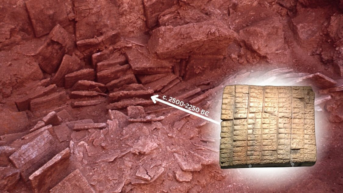 Image: Cast of a terracotta tablet from Ebla, Davide Mauro, CC BY-SA 4.0, Wikimedia Commons + Ebla tablets, Moshe Marlin Levin and Meitar Collection and National Library of Israel and The Pritzker Family National Photography Collection, CC BY 4.0, Wikimedia Commons.