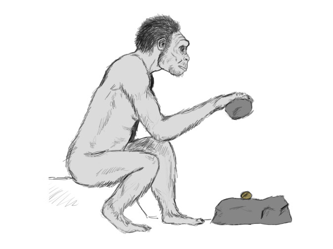 Ref: Creation, “Artists’ Impressions.” Imagen: Nut cracking Homo habilis, William Daniel Snyder, CC BY-SA 4.0, Wikimedia Commons.