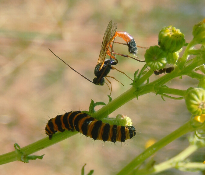 Ref: Science News, David Shiga, “Poisonous Partnership.” Imagen: Parasitoid wasp pointing ovipositor at cinnabar moth larva, Ian Alexander, CC BY-SA 4.0, Wikimedia Commons.