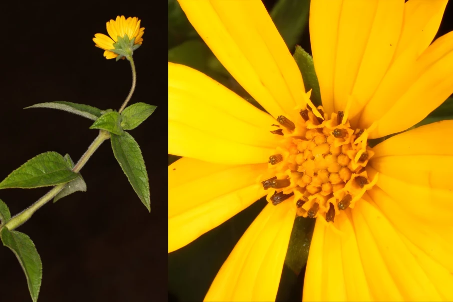 Image: Aspilia africana plant, Peter B. Phillipson, CC BY-SA 4.0, Wikimedia Commons + Aspilia africana flower closeup, Peter B. Phillipson.