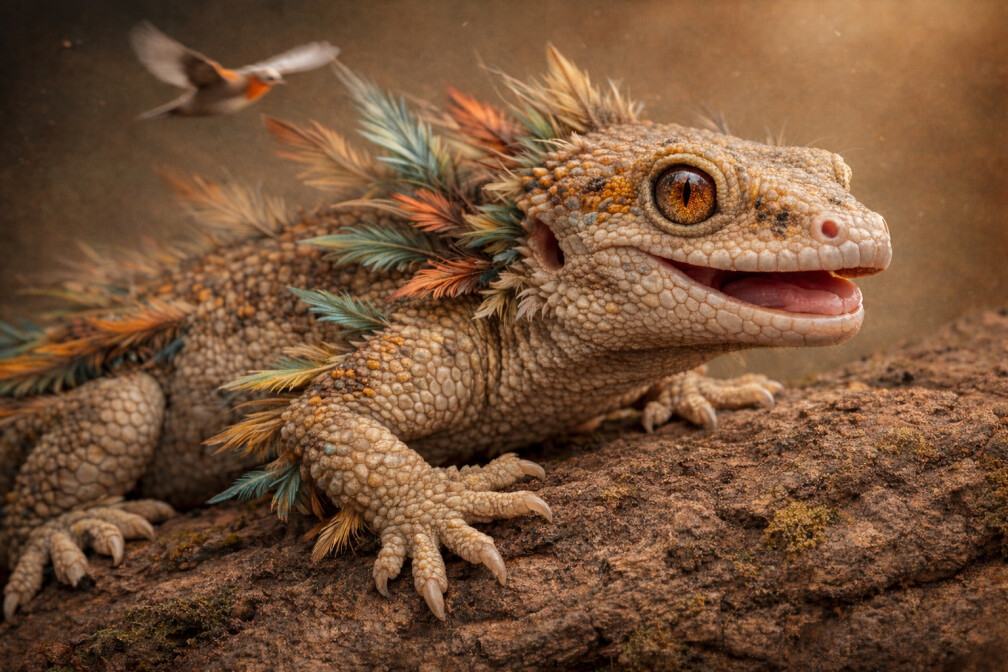 The elegance and beauty of the feather make this story hard to believe. Can sticking a feather on a lizard produce a peacock? The bird’s feather is only a small part of the complete flying system of the bird. Even with very careful planning and redesigning, a reptile doesn’t have what it takes.