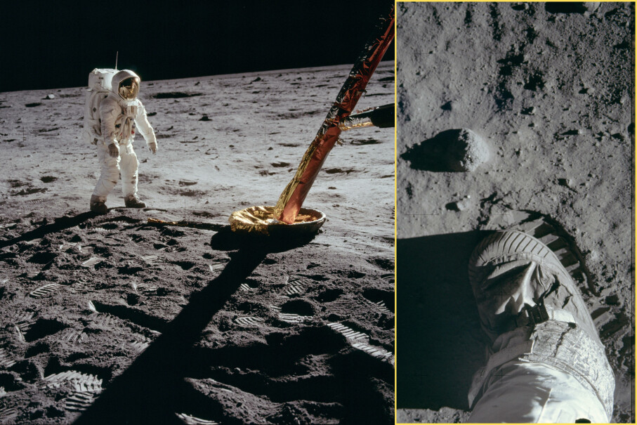 Image: Astronaut Aldrin stands looking at the lunar module at Tranquility Base, Neil A. Armstrong, PD, Wikimedia Commons + Project Apollo Archive (boot in moon dust), PD, Wikimedia Commons.