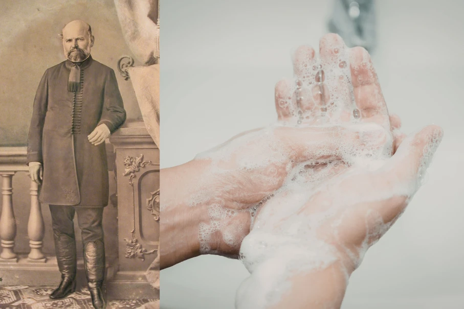 REF.: Thompson, Bert. Dr. Semmelweis & the Bible. Reasoning from Revelation. Image: Ignaz Semmelweis (1818-1865), Ludwig Angerer, PD, Wikimedia Commons + Person washing hands.