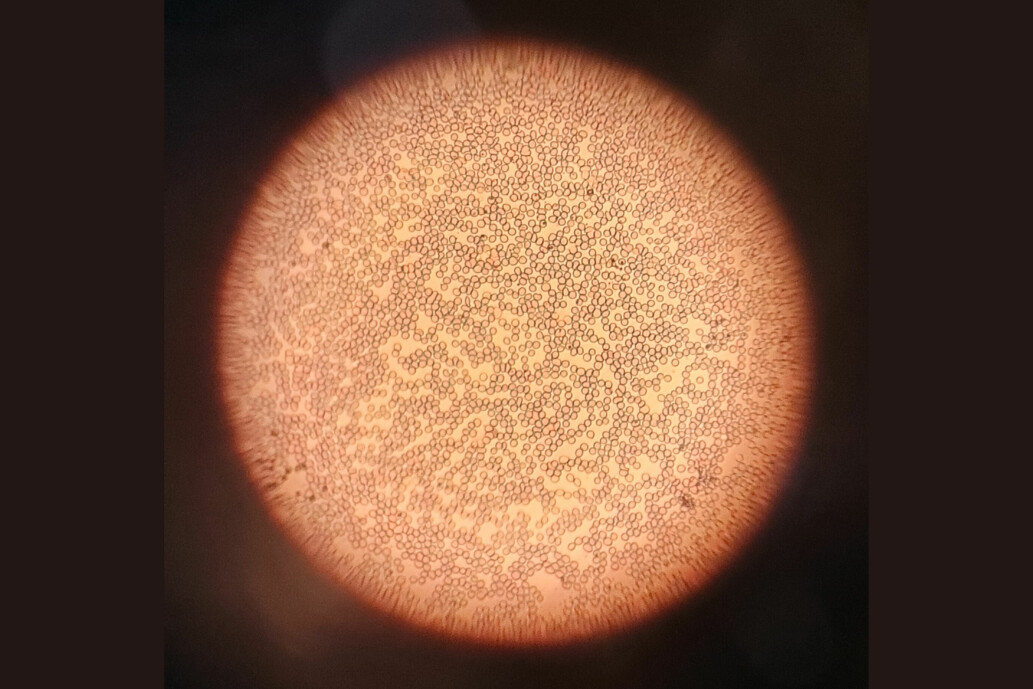 Ref: Science News, Ben Harder, “Blood, Iron, and Gray Hair.” Image: Red blood cells under microscope, Koshur, CC BY-SA 4.0, Wikimedia Commons.