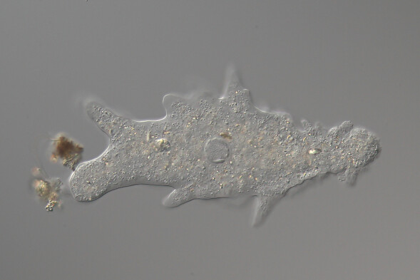 Ref: Science News, D.C., "How smart are amoebas?" Image: Amoeba proteus, SmallRex, CC BY-SA 4.0, Wikimedia Commons.