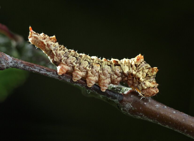 Ref: I. Wickelgren. “Caterpillar Disguise: You Are What You Eat.” Science News, v. 135, p. 70. Image: Scalloped hook-tip (Falcaria lacertinaria) larva, Patrick Clement from West Midlands, England, CC BY 2.0, Wikimedia Commons.