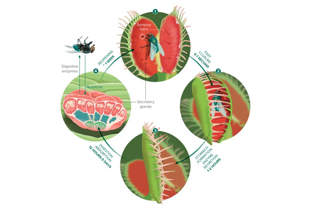 When an insect lands on a leaf and touches one of these filaments, the two halves of the leaf close together firmly taking as little as 100 milliseconds or as long as two to three minutes. The closing pressure is sufficient for the outline of the insect to be seen on the outside of the leaf (p. 307). During the closing process, the moving spikes retain large insects, but smaller insects can still escape (p. 311). The digestion process can take one or two days, during which time digestive juices are exuded from the leaf surfaces and the decomposed organic body is adsorbed by the same glands.