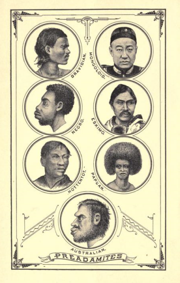 The great ages claimed by Egyptian tomb records could also be explained away as part of the pre-Adamite race. Alexander Winchell (1824-1891), professor of geology at the University of Michigan, produced a masterful work in 1880 titled Pre-Adamites, in which he argued for a single origin of man from ape stock followed by diffusion and formation of the colored races. The Adamites split off from one of these races, the Dravidians found in India, and became the Caucasians, part of whom later became the Israelites. Winchell claimed that the Bible is only concerned with the history of the Israelites, including their descent from Adam. Although he believed he had written a tightly-argued Christian apologetic, the book is blatantly racist, containing, for example, illustrations of Negro and ape heads in profile, suggesting descent.