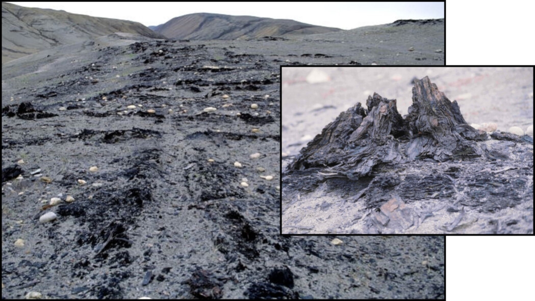 In 1986, a "frozen forest" of tree stumps was discovered on Axel Heiberg Island, Canada's most northerly point of land. The tree trunks (seen above) and branches with blackened leaves were horizontal and easily recognized to be of the meta sequoia variety; some had 18-inch diameter trunks, while the wood was still fresh. All this in growth positions 2000 miles above the present tree line! Moreover, the unmineralized bones of alligators, camels, lions, bears, and mammoths were found in heaped profusion beneath the fallen trees. The forest and remains are officially claimed to be 40 million years old, however, this author knows that samples of the wood were subjected to the Carbon 14 test and found to dated at 41,000 years! This has never been reported.