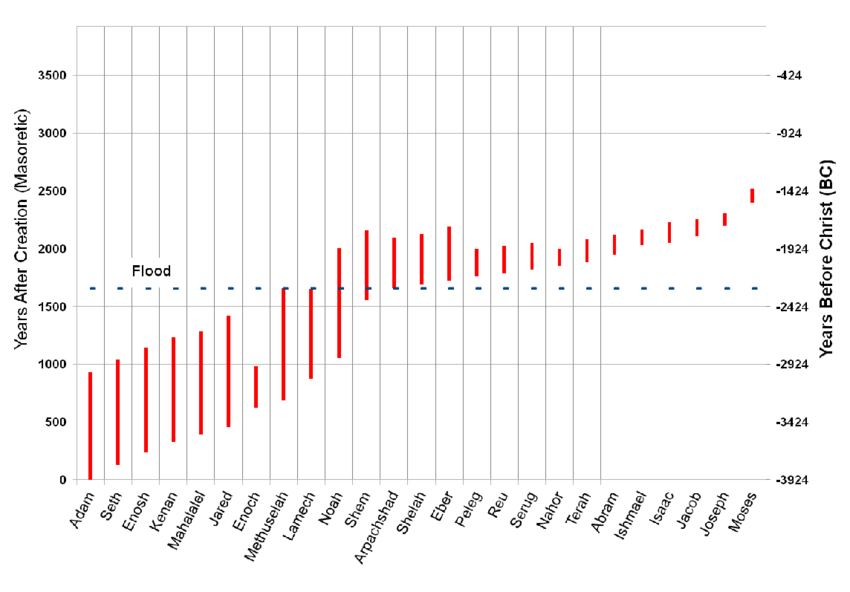 Images: Dublin Christ Church Cathedral, Adam Naming the Animals, Andreas F. Borchert, CC BY-SA 3.0 DE, Wikimedia Commons. Lengths of lives, Adam to Moses, shown in masoretic years after Creation (left axis) and in years before Christ (right axis), Miller, James. (2021). Is Our Terminal Age 120 Years? An Interesting Parallel.