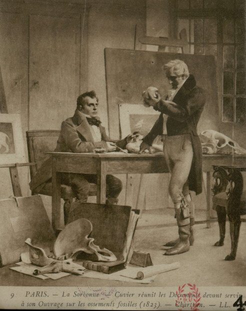 Images: Cuvier brings together the documents to be used for his work on the fossil bones, by Theobald Chartran, Sorbonne Interuniversity Library, Cropped. Charles Lyell, Popular Science Monthly Volume 1, PD, Wikimedia Commons. Fossilized seashell at Point Peron, Calistemon, CC BY-SA 4.0, Wikimedia Commons.